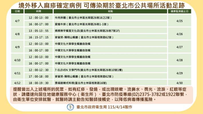 臺北市新增1例麻疹境外移入確定病例,為10多歲外國籍男性,3月29日入境後於4月7日開始有發燒、喉嚨痛症狀,4月11日從臉、手部到身體出現紅疹,4月12日就醫後經醫師評估懷疑麻疹通報採檢,於4月14日經疾病管制署研判為確定病例。臺北市政府衛生局針對此個案匡列接觸者共164人,包含同住者、同學及就醫接觸者,將持續進行健康監測至4月30日。北市衛生局說明個案於可傳染期間有公共場所活動史(如附表),相關場域均已加強清消,提醒曾與個案足跡重疊者,請進行自主健康監測至4月30日。北市衛生局提醒,麻疹會透過空氣、飛沫及接觸確診者的分泌物而傳染,傳染力非常強,確診者出疹前4天至後4天皆具有傳染力,感染後會有發燒、咳嗽、流鼻水、鼻炎、結膜炎及出疹等症狀。接觸者健康監測期間如無症狀可正常生活,建議要佩戴口罩,儘量避免出入人多擁擠的公共場所及接觸小於1歲嬰兒、尚未完成麻疹、腮腺炎、德國麻疹混合疫苗(MMR)接種之幼童、孕婦或免疫不全病人。如有紅疹、發燒,或出現咳嗽、流鼻水、畏光、流淚、紅眼等疑似症狀,請儘速與居住地健康服務中心、臺北市防疫專線(02)2375-3782或1922聯繫,由衛生單位安排就醫,就醫時請主動告知醫師接觸史,以降低病毒傳播風險。北市衛生局說明,接種疫苗是預防麻疹最有效的方法,目前國內提供6歲以下幼兒2劑公費麻疹、腮腺炎及德國麻疹混合疫苗接種,家中若有出生滿12個月及滿5歲至國小入學幼童,且尚未完成「麻疹、腮腺炎、德國麻疹混合疫苗(MMR)」各1劑者,請儘速攜帶幼童前往本市合約醫療院所完成疫苗接種,以建立免疫力、降低感染風險;疫苗接種與合約醫療院所相關資訊可向臺北市十二區健康服務中心或撥打臺北市防疫專線(02)2375-3782洽詢。有關麻疹相關資訊可至衛生局官網/主題專區/傳染病預防/麻疹專區查詢,或致電1922或臺北市防疫專線(02)2375-3782詢問。